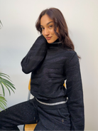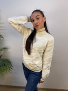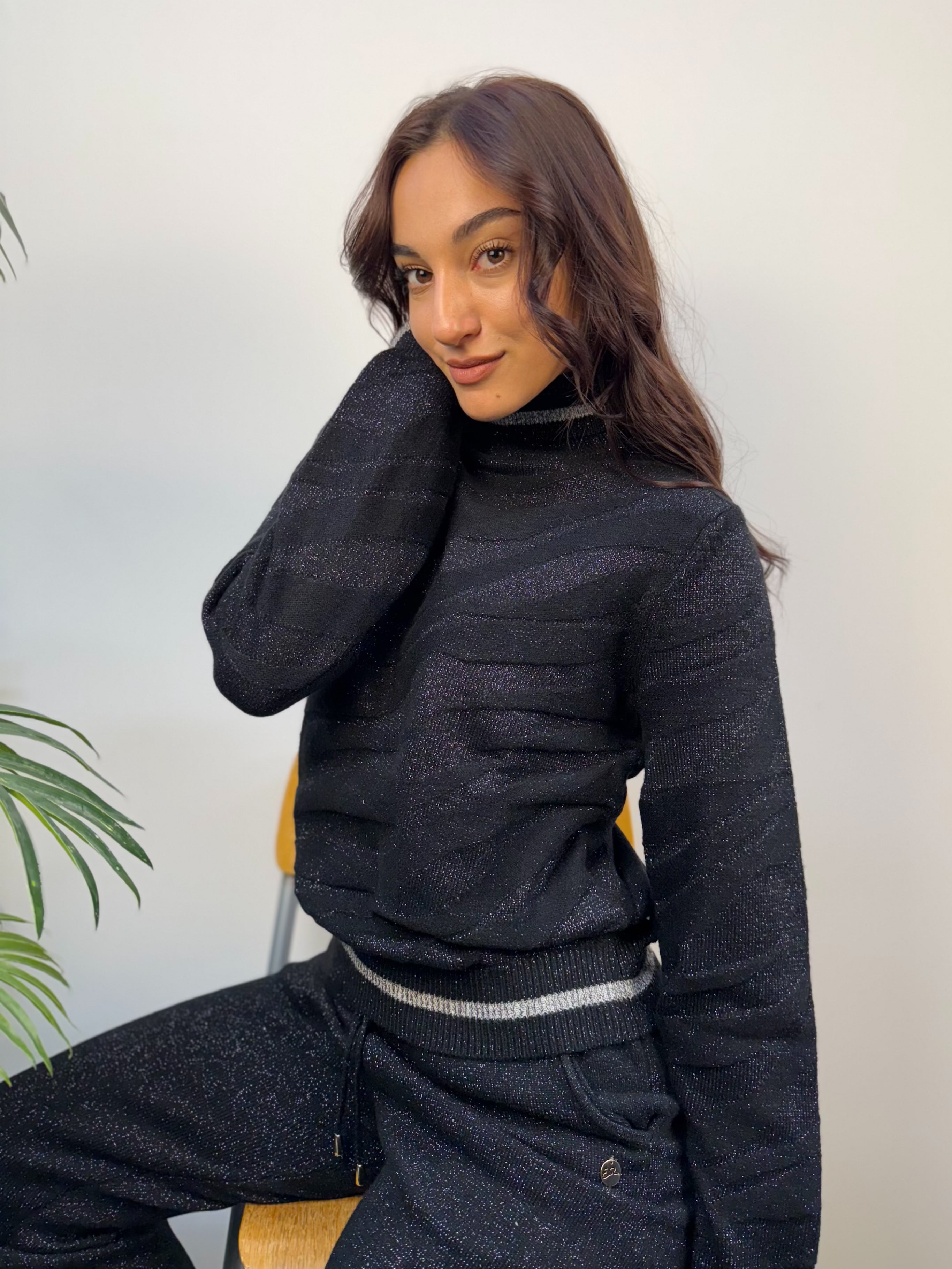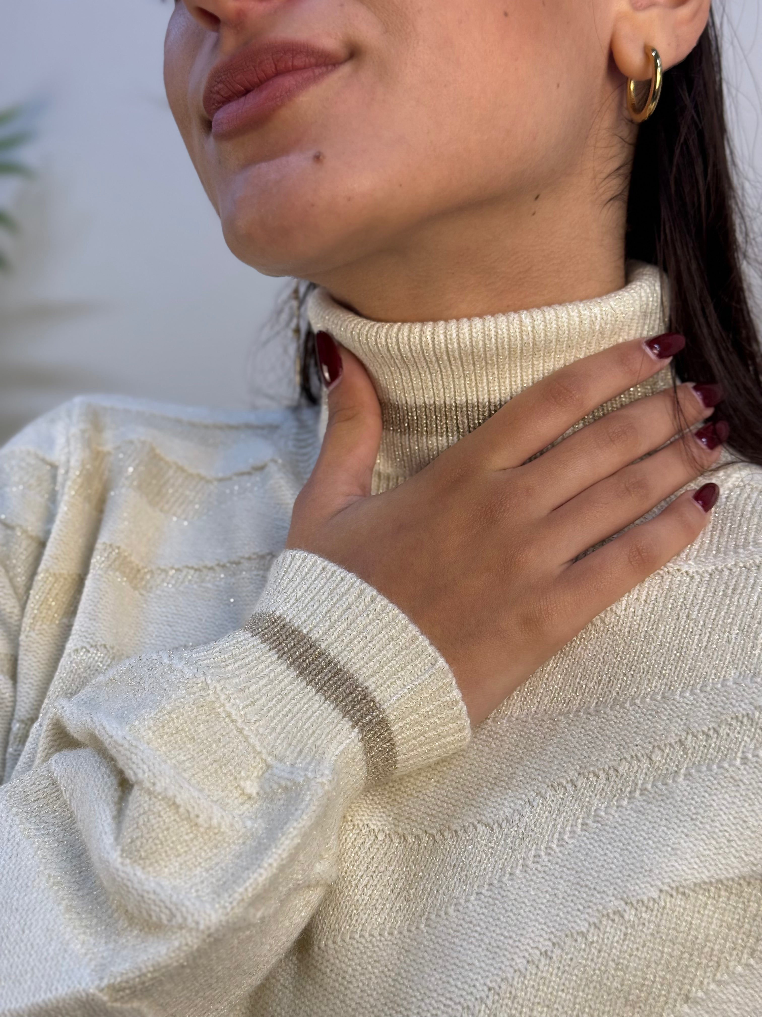 Il collo alto avvolgente aggiunge un tocco elegante e accogliente, mentre la vestibilità confortevole e i dettagli curati rendono questa maglia perfetta per valorizzare anche i look più semplici con raffinatezza e luce.