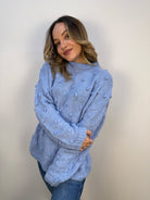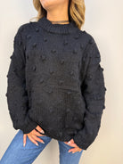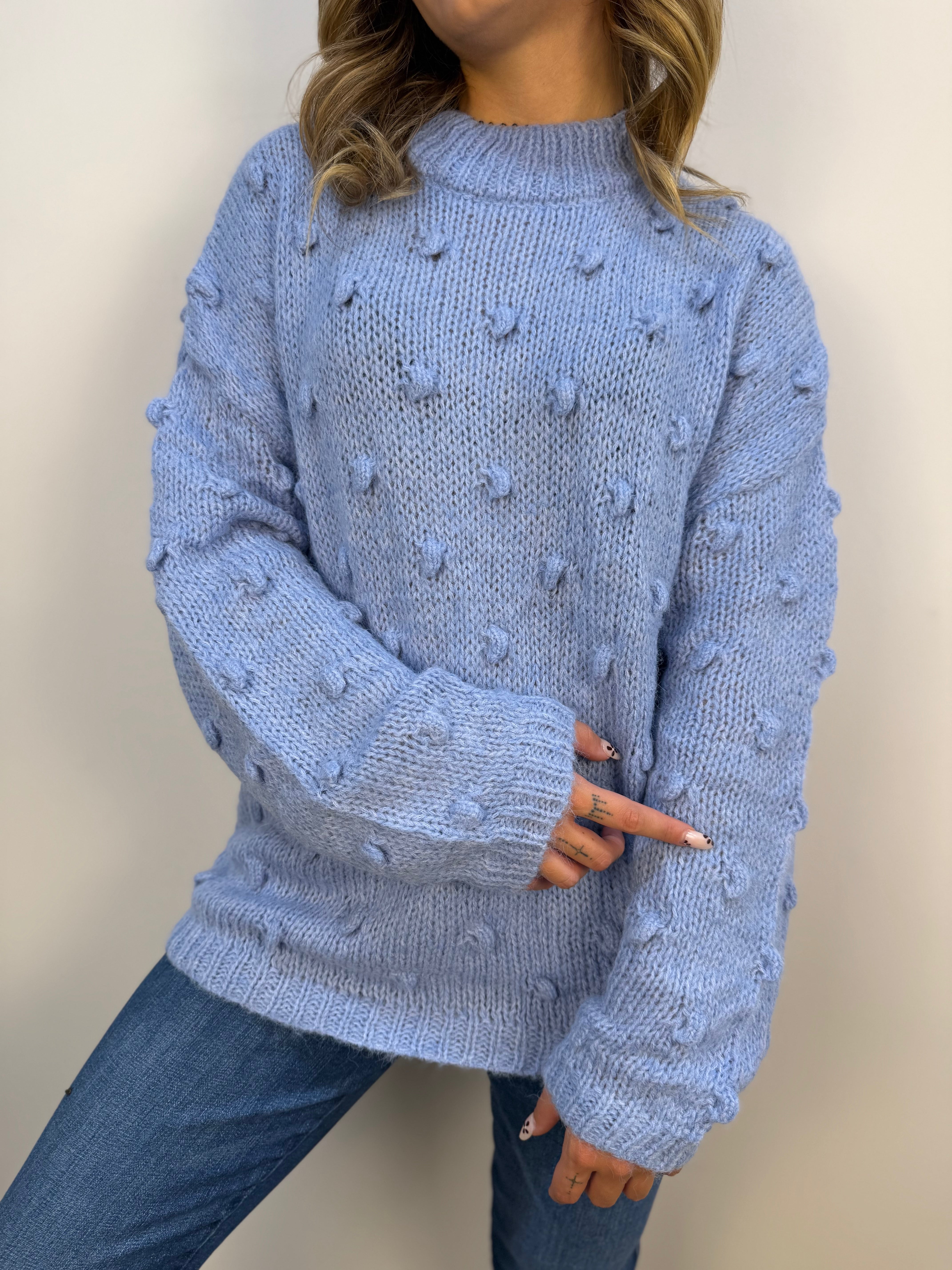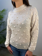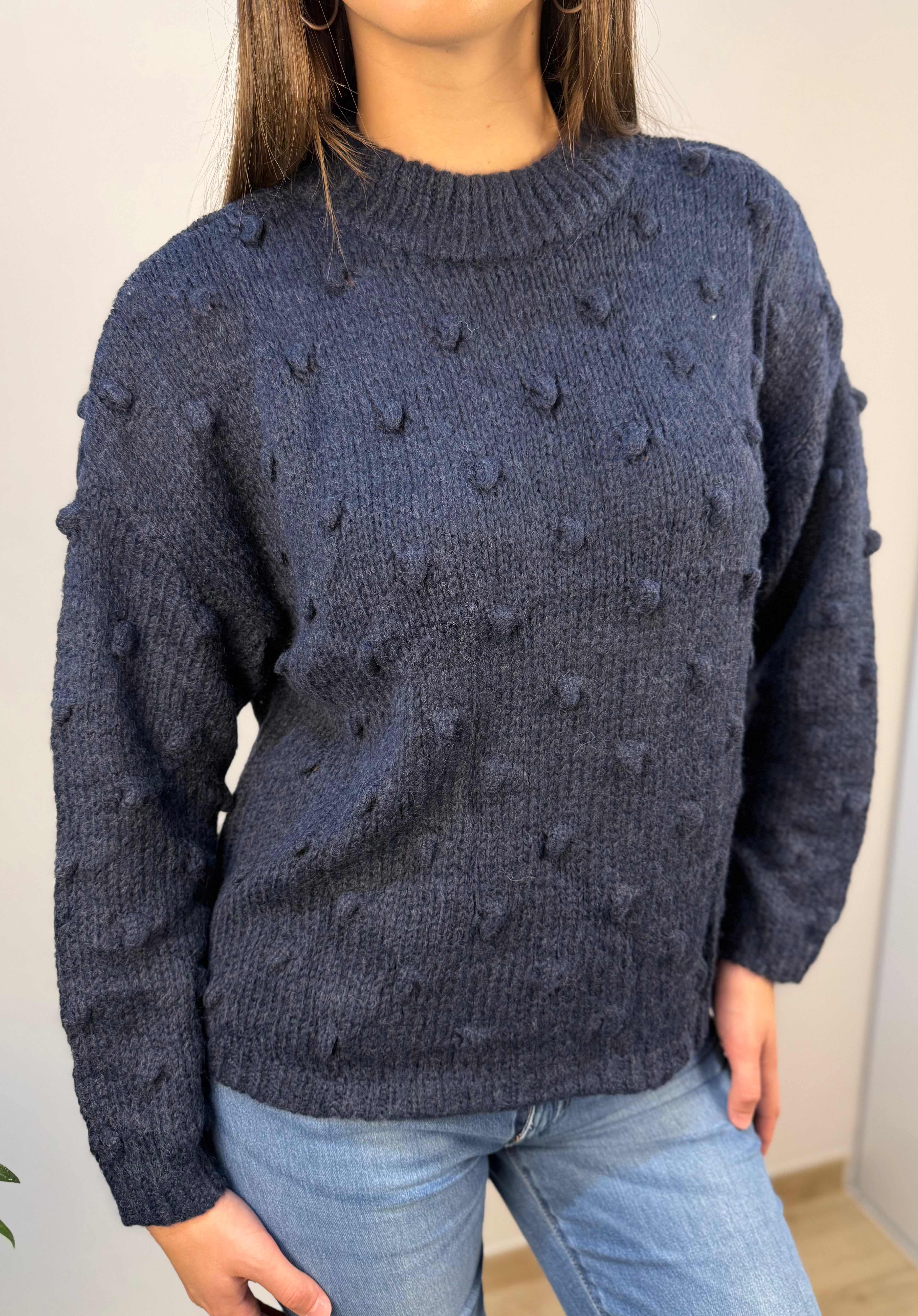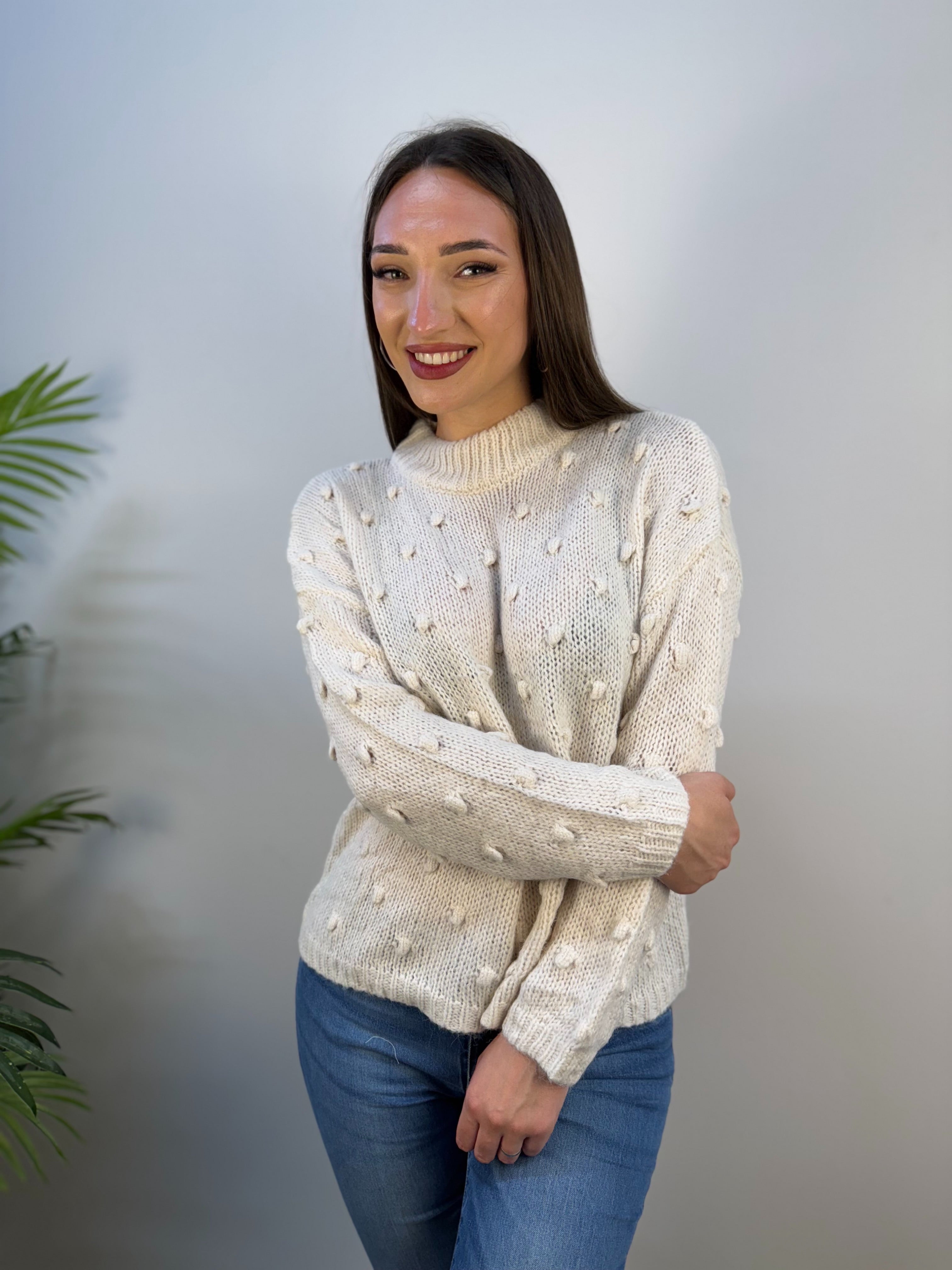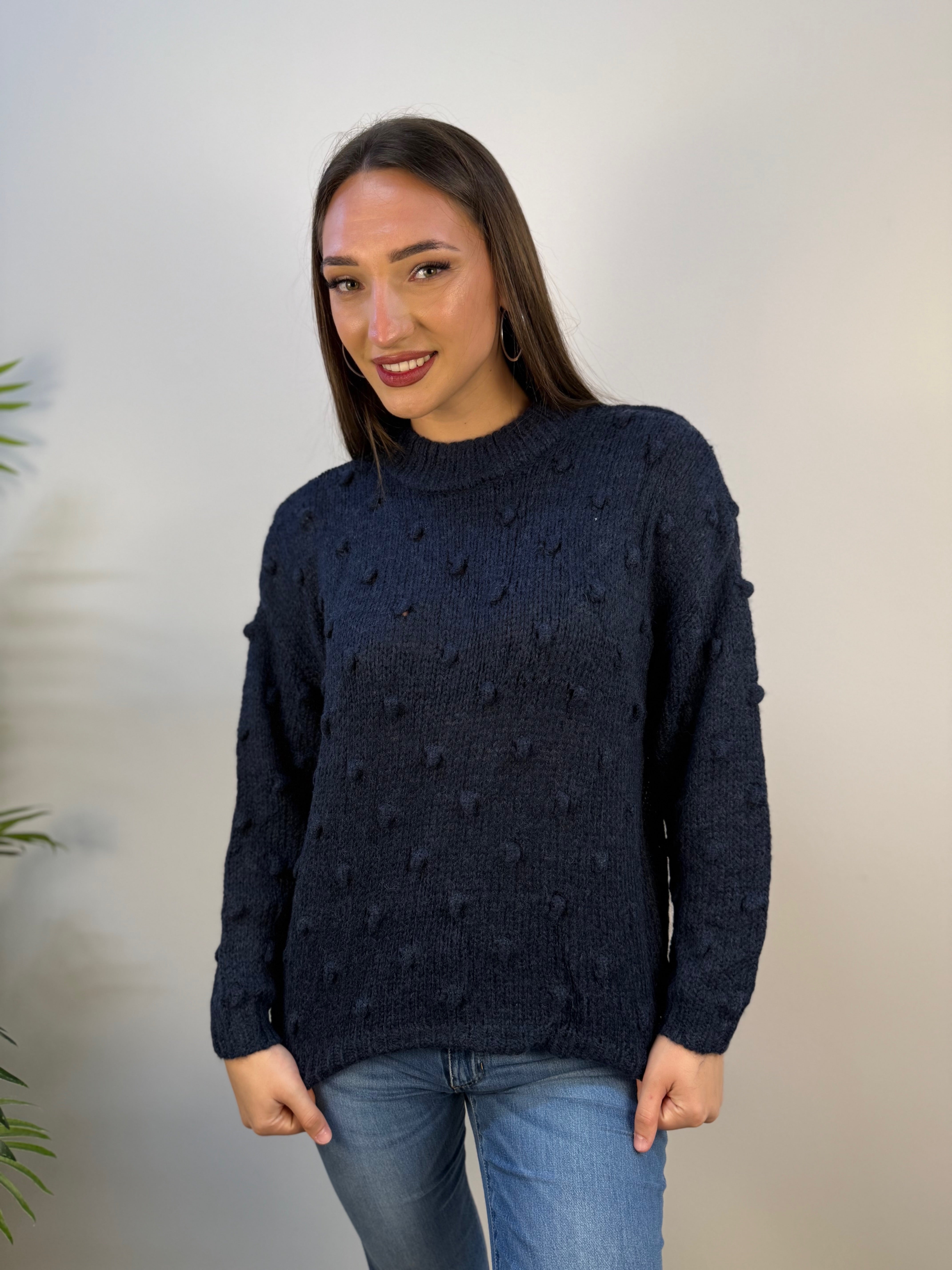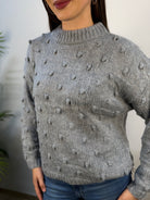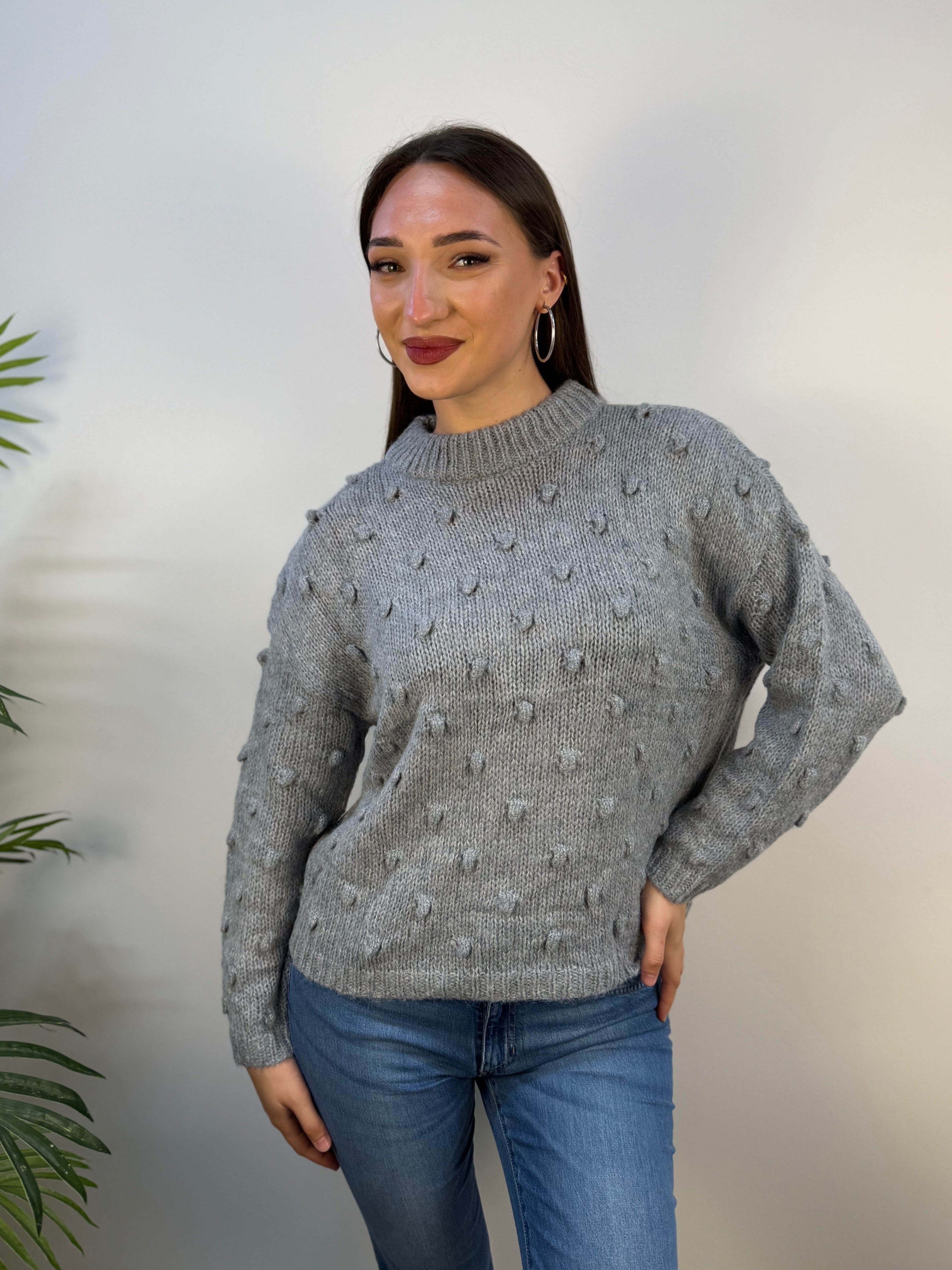 Maglione Akè con scollo leggermente alto e una delicata lavorazione in rilievo, caratterizzata da piccoli pois di tessuto distribuiti all over. Morbido e confortevole, dona un tocco di eleganza discreta grazie ai dettagli tattili e alla linea essenziale. Proposto in diverse varianti colore, è ideale per completare con stile sia look casual che più curati.