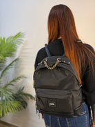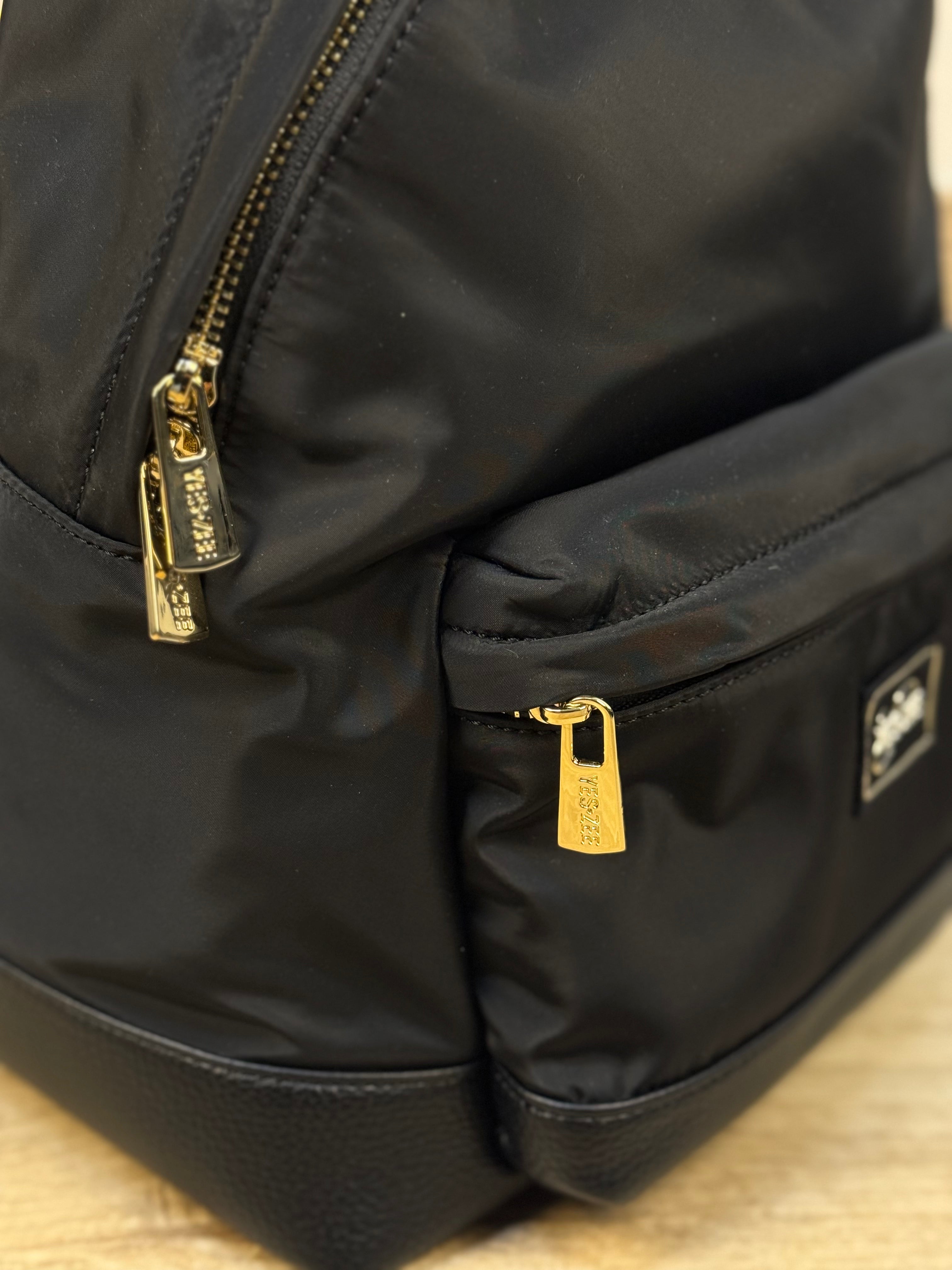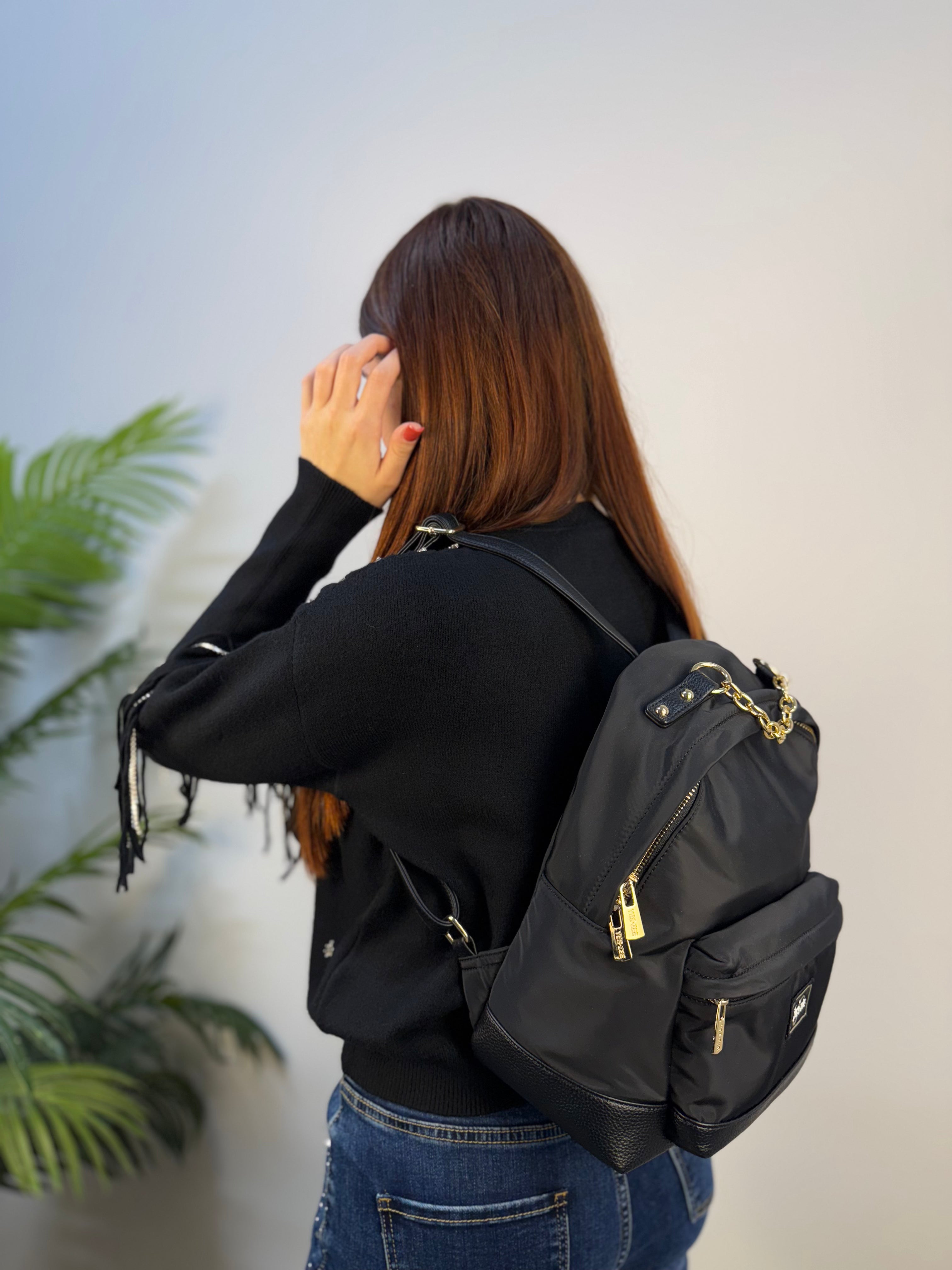 Zainetto Yes-Zee realizzato in tessuto tecnico, impreziosito da dettagli in similpelle pitonata che valorizzano il design — come le bretelle regolabili e il fondo rinforzato. Il manico in catena dorata richiama i dettagli metallici delle zip, aggiungendo un tocco moderno e sofisticato. Sul fronte presenta una taschina con chiusura a zip e patch logata applicata, mentre l’inserto principale si chiude comodamente con una zip. All’interno, uno scomparto spazioso ospita una tasca con chiusura a zip e una patch logata in similpelle, per un tocco di stile anche nei dettagli. Uno zainetto versatile e raffinato, perfetto per accompagnare la quotidianità con funzionalità ed eleganza.